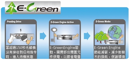 華碩綠色節能技術「E-Green Engine 智能休眠技術」能夠大大節省光碟機在待機狀態下的耗電量。華碩E-Green Engine 智能休眠技術,會在光碟機進入待機狀態時自動啟動。無論光碟機內部是否有碟片,它都會偵測用戶的操作狀況,如果在 60 秒內沒接到操作命令,它會自動進入較節能的 Idle 模式;繼續偵測 90 秒後,如果仍沒有操作命令,它會轉入 E-Green 模式,關閉其內部沒有被使用到的元件,減少電量消耗。