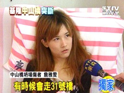 對於事發經過完全不記得,她就是驚險從中山橋上摔落的女孩,因為腦震盪造成暫時性意識喪失,臀部和手肘、前臂也都有挫傷,詹小姐接受訪問時 還驚魂未定,因為當時天橋突然應聲斷裂,水泥飛散四處,詹小姐直接被天橋甩了出來,這一刻 她完全嚇傻了,趴跪在地上過了好幾秒才定住神,自己慢慢一步一步爬出水泥天橋。