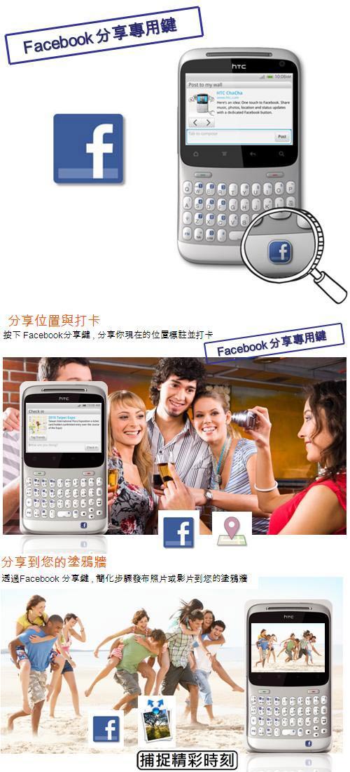 HTC ChaCh 配備 Facebook 專屬按鍵 ,讓使用者能輕鬆開啟 Facebook 中常用的功能。同時,Facebook 專屬按鍵會視情況而提供不同功能,當更新的內容傳來時,會有燈光閃爍提示。此外,按一下按鍵,可即時更新狀態、上傳相片、分享網址、你正在聽的歌曲,或是在你喜愛的地點簽到等等。
