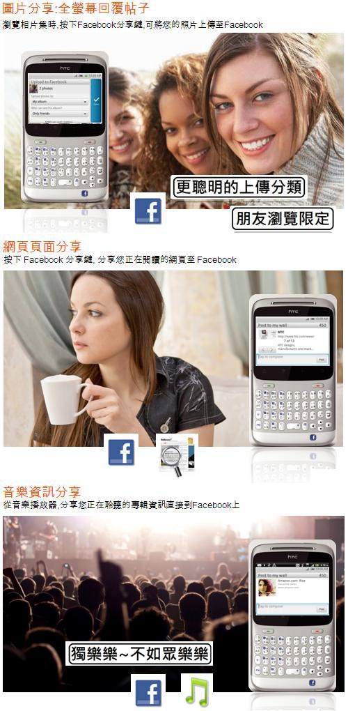你用手機為朋友拍下照片,按一下Facebook專屬按鍵,即可上傳到Facebook;當你用手機聽音樂時,透過Facebook專屬按鍵,你所聽的音樂名稱就會自動分享在Facebook上,讓全世界都知道你正在聽什麼歌曲。